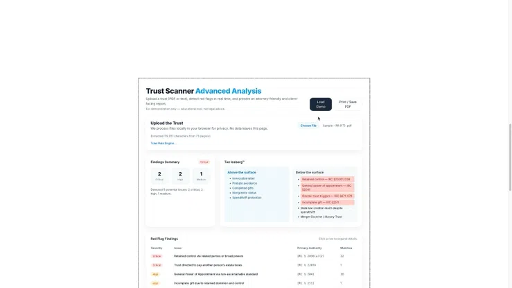 Install state-of-the-art Estate, Trust, and Tax Compliance Scanners that process hundreds of pages in seconds, spotting red flags, conflicting terms, and related codes and cases.