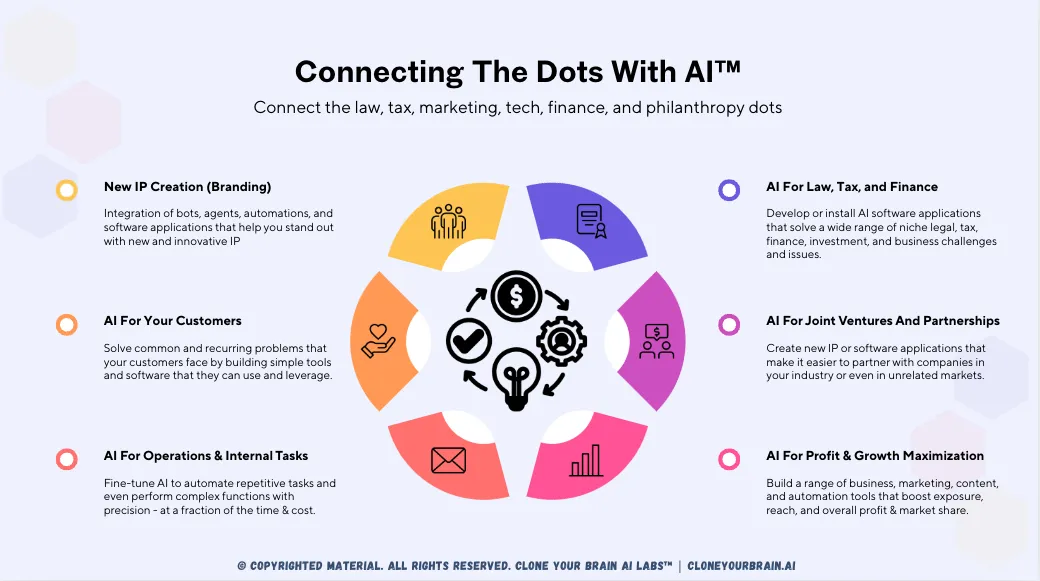 We have built over 50 unique and innovative law, tax, finance, marketing, growth, compliance, investment, nonprofit, and philanthropy AI agents, bots, and tools that you can explore and leverage in innovative ways.